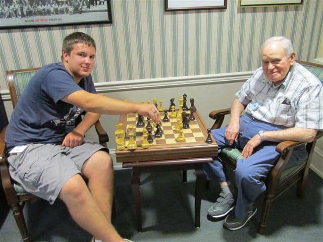 At Collingswood Manor there is a beautiful chess board in the coffee room, off of the main lobby. If residents know how to play they may use it at any time. If they would like to learn how to play, volunteer, Ed Bohn can show them how. Below Jack Geigelman receives instruction from Ed.
