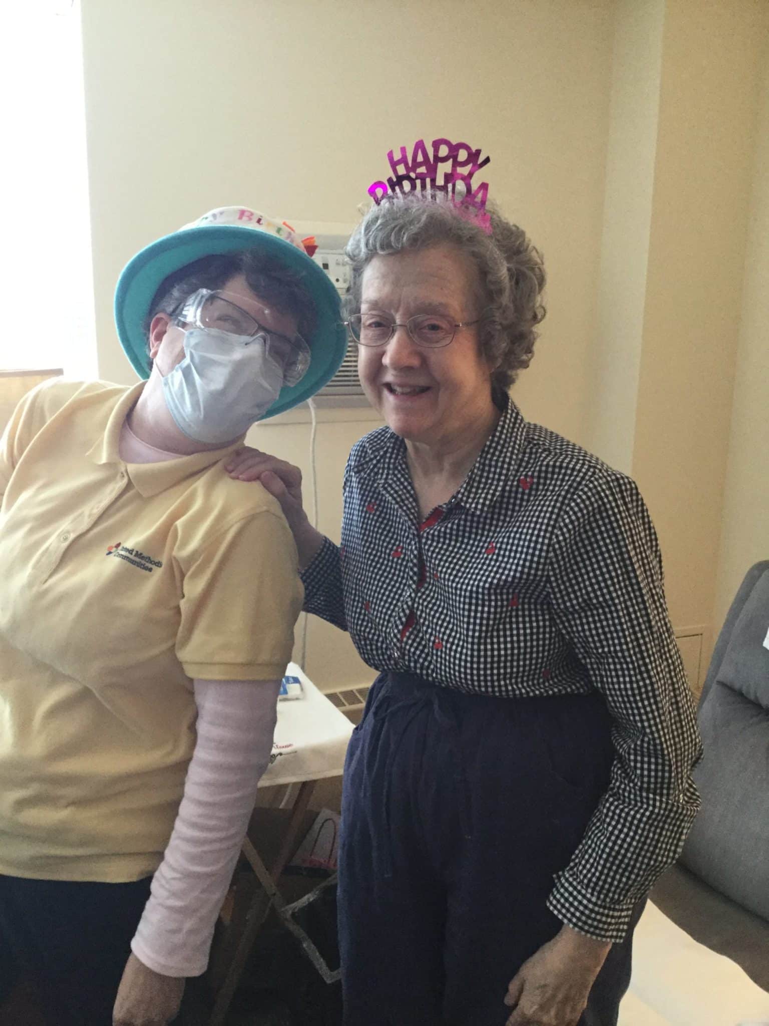 Community Life Associate Wendy J. makes resident Joan L. smile (yes they are smiling under the masks) on her birthday