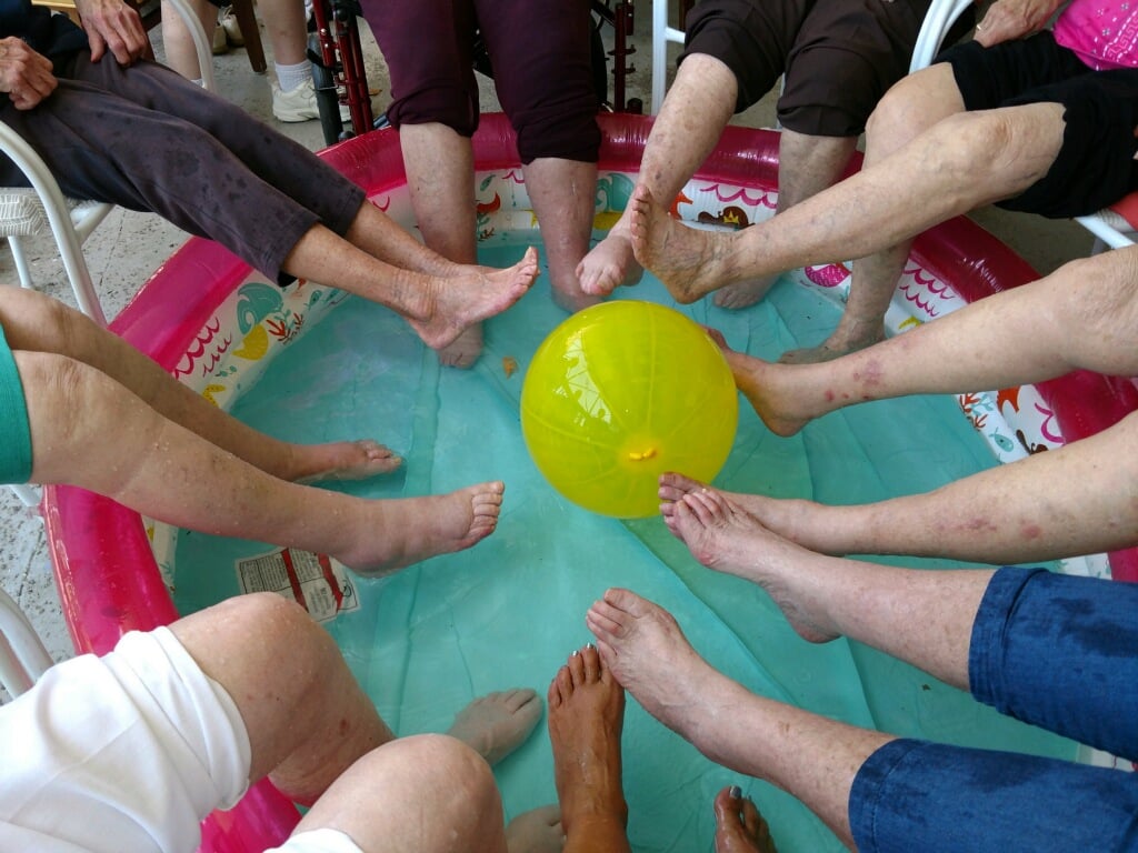 Residents dip their toes in the cool water during the Get-Along Gang’s summer pool party.