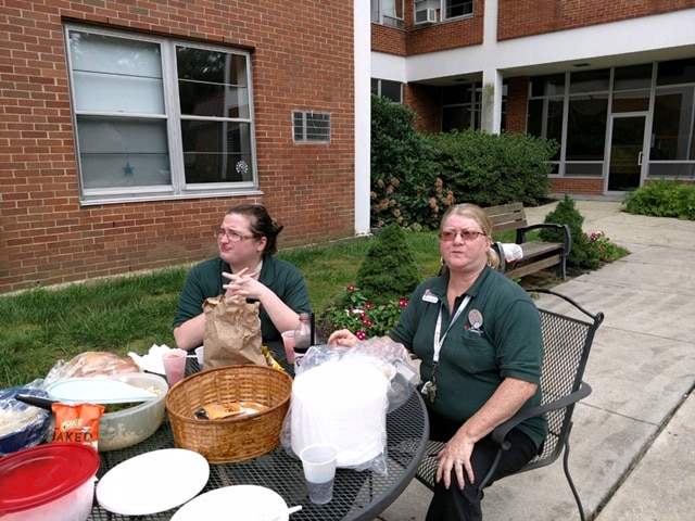 Housekeepers, Phyllis Murphy and Cindy Kern, take a break from serving lunch to soak up some sunshine during the Get-Along Gang’s summer picnic.